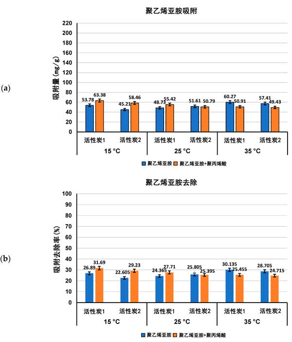 彩运cy888 图2:聚乙烯亚胺吸附量(a)及其从活性炭表面去除的百分比(b)在单一和混合吸附物系统中,在三个检测温度pH3下。