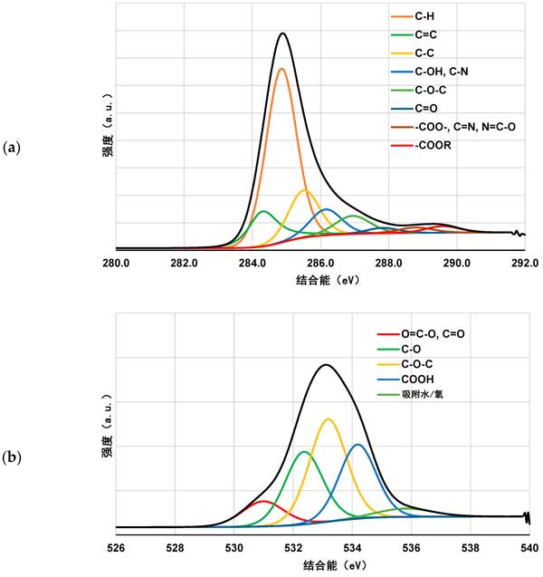 图4:聚合物吸附前活性炭的C1s(a)和O1s(b)光谱。