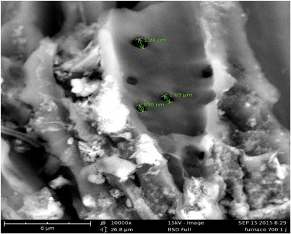由于上述陶瓷膜去除污染物的多重优势和有前途的特性,分析陶瓷膜中不同活性炭和氧化铁粉末含量的影响。使用扫描电子显微镜研究活性炭材料的微观结构。图1描绘了使用ZnCl2/50vol%在10,000倍放大倍数下活化后的活性炭的孔隙。发现活性炭的孔径显示尺寸范围在0.93μm–1.26μm之间。