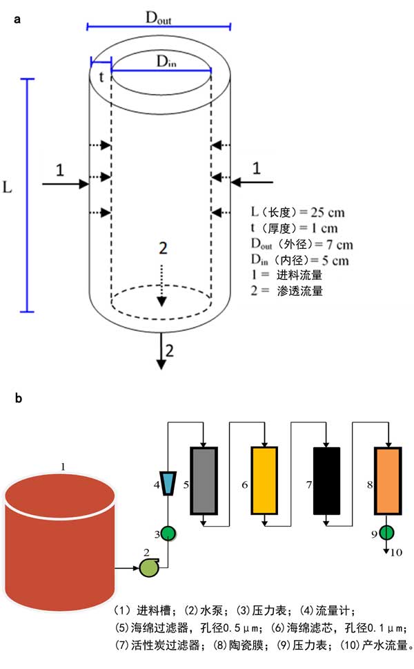 彩运cy888 图2:(a)陶瓷膜的示意图,(b)水处理工艺流程示意图。
