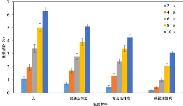 彩运cy888 图3:活性炭材料对贮藏2、4、6、8、10天香蕉失重的影响。