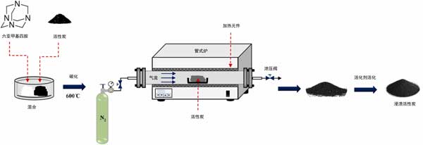 彩运cy888 将一定量的无烟煤作为活性炭源添加到六亚甲基四胺中,然后充分混合。接下来,将所得产品置于连续N2流下的管式炉中(示意图1)。然后我们用KOH作为化学活化剂以3/1的比例对所得产物进行化学活化。接下来,所得产品在温度为120℃的烘箱中干燥24小时。为了去除杂质和未反应的化学试剂,我们用HCl溶液(3M)洗涤样品6小时,然后用去离子水中和所得产物。随着原材料和浸渍物的用量(比例4/1)的变化,我们合成了几个样品,并将它们表示为浸渍活性炭A-D。为了进一步研究,我们还用了普通活性炭来进行实验对照。
