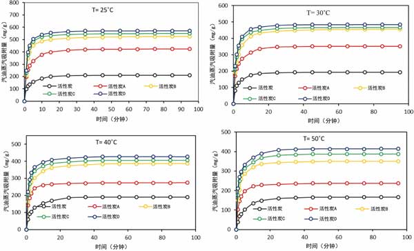 经过进一步研究,发现活性炭D样品比其他样品更能增强汽油蒸汽吸附,这表明表面结构在捕获分子方面的重要性和关键作用,正如预期的增强吸附一样。事实上,与其他合成样品相比,活性炭样品具有更高的表面积和丰富的微介孔,可以显着提高吸附量图2。我们还研究了活性炭用量对吸附容量的影响。正如发现的那样,随着活性炭的用量增加,蒸汽吸附能力可以进一步提高,这可能是由于通过提高活性炭量,表面积和孔隙反而增加,进而可能有助于增强吸附。鉴于发现随着活性炭用量比从1增加到4,汽油蒸气吸附能力提高。