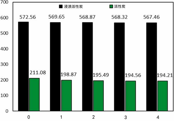 彩运cy888 为了研究吸附剂吸收汽油蒸汽的性能,我们进一步评估了样品在吸附-解吸循环中的可重复使用性。在恒温下,1小时后,当吸附剂达到饱和状态时,浸渍再生过程。四个吸附循环后,蒸汽吸附容量为567mg/g,所用吸附剂保持大量吸收分子。HMTA-AC-D样品表明蒸汽吸收略有减少约0.89%,而活性炭样品的这一量为7.9%(图3)。在高循环下,由于孔隙的逐渐破坏和不完全脱气,吸收量可能会显着降低。根据我们的发现,与文献相比,制成的吸附剂在物理和热学上表现出更高的稳定性。这些结果表明,样品在回收汽油蒸汽时具有很高的可持续性,可以作为一种有效的吸附剂提出并考虑。
