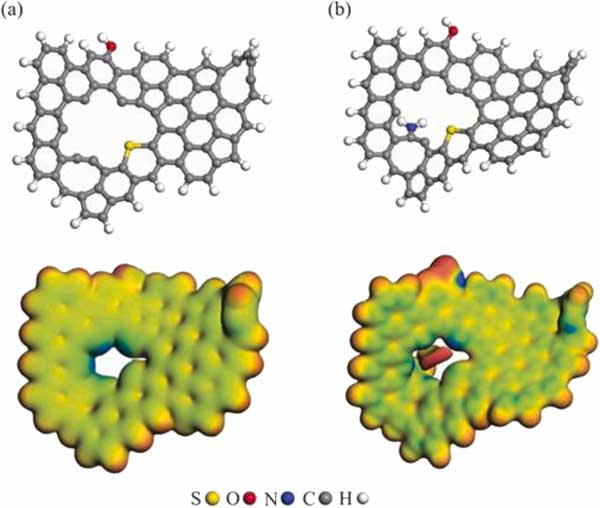 图4:(a)活性炭和(b)浸渍活性炭吸附剂的优化几何结构(上图)和相应的MEP等值面。