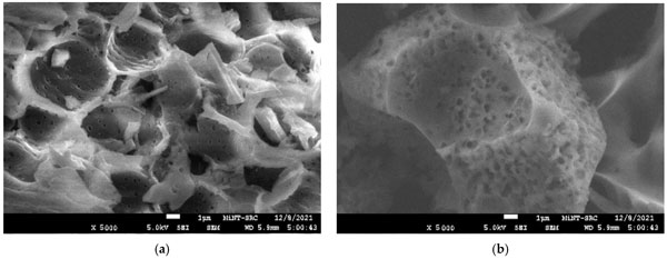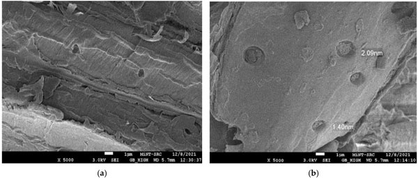 使用FESEM分析观察了活性炭产品的浸渍和碳化温度影响的形态变化。图1a、b描绘了木质素在被激活之前的表面形态。它显示出厚而平坦的图案,中间有小裂缝。这归因于大量的木质素,一种酚类聚合物,赋予植物结构强度,使其具有坚硬粗糙的木材状结构。在图1b中,发现前体具有压实的表面,上面有浅而堵塞的孔隙图案。这可能是由于烘箱干燥过程中预处理和加热过程的反应。从图1a、b,由于无孔表面的存在,表面清楚地显示为不令人满意的吸附材料。