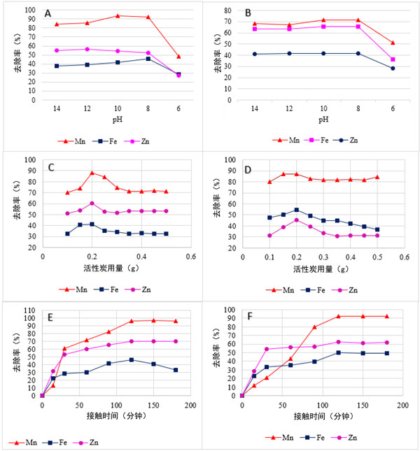 在分批吸附研究中,pH值是一个重要因素,它会通过改变所用吸附剂的表面电荷分布来影响吸附过程。在6和14的范围内观察到木材加工废水中重金属(Mn、Fe和Zn)的pH相关影响。图3A、B清楚地表明,当纤维板加工废水中的Mn、Fe和Zn分别使用pH8时,两种活性炭均获得最佳结果。