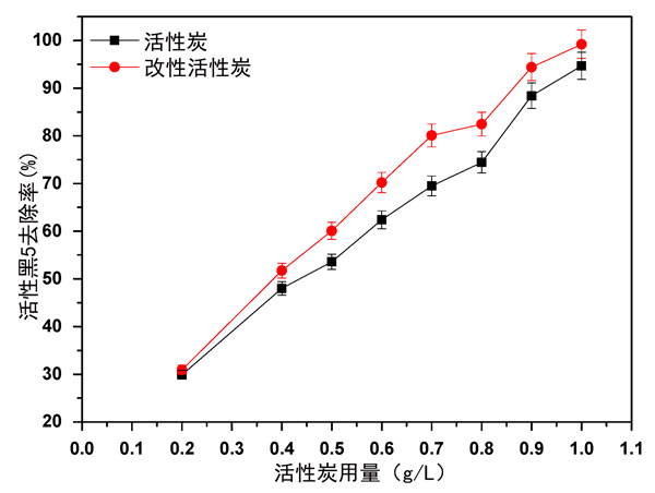 彩运cy888 图2:与活性炭相比,改性活性炭用量对活性黑5吸附的影响。