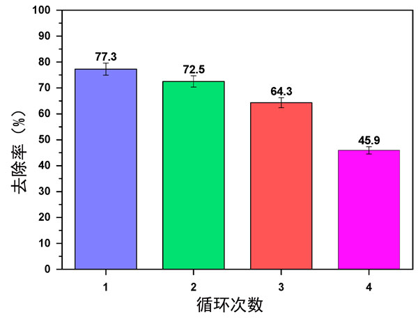 通过回收研究调查了改性活性炭的再利用以从废水中去除活性黑5。进行实验时,最初使用100mg/L活性黑5和0.8g/L的改性活性炭,pH值为2。在第一个循环之后,使用0.01M/NaOH溶液对所使用的改性活性炭颗粒进行处理大约2小时。此后,用蒸馏水冲洗颗粒以除去任何残留的碱。选择被认为可接受的重复时间,以便能够在后续循环中重复使用吸附剂。研究结果如图3所示。在用1M/NaOH处理成功再生后,解吸的改性活性炭能够重复使用多达四个循环以去除活性黑5。活性黑5的去除百分比在第一个循环中约为77.3%,在第四个循环后下降至约45.9%。总的来说,这项研究证明了将改性活性炭吸附剂重复使用四个循环以从废水中去除活性黑5的潜力。