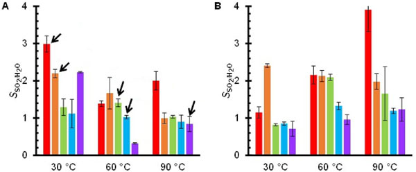 图2:对于再生条件,五种活性炭在T=30、60和90℃的吸附温度下的SO2/H2O选择性。