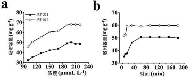 图1:两种活性炭对铜离子的(a)等温吸附和(b)动态吸附。