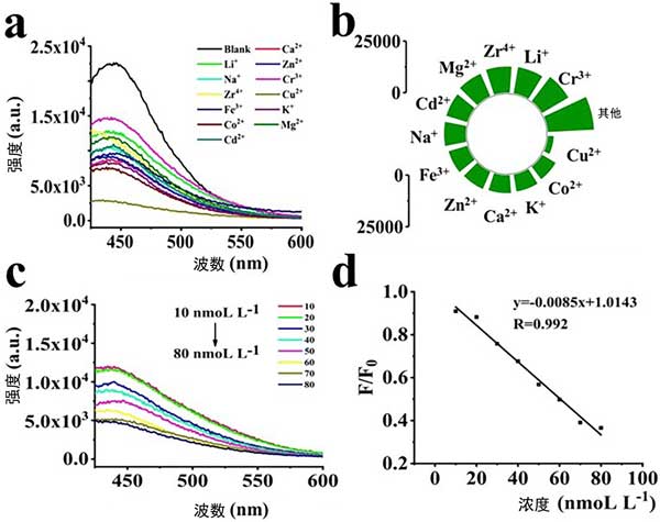 图2:(a)12种金属离子的纳米活性炭点的荧光发射光谱,(b)360nm处的荧光强度,(c)不同浓度Cu2+的荧光发射光谱,(d)Cu2+检测的线性曲线。