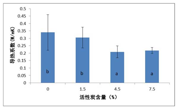 图3:活性炭增强欧松板的导热率值。图3中的字母(a和b)表示具有同等重要性的样本组聚集在一起。