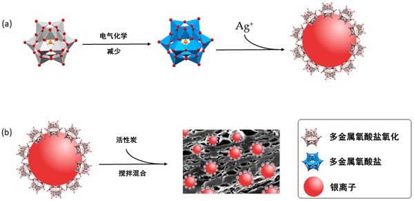 彩运cy888 图1:(a)多金属氧酸盐纳米银的合成示意图,其中多金属氧酸盐同时充当还原剂和稳定剂,(b)三组分多金属氧酸盐纳米银杂化材料的制备过程。不在规模上,多金属氧酸盐的大小为1nm,纳米银的大小约为27-43nm,具体取决于初始试剂浓度。