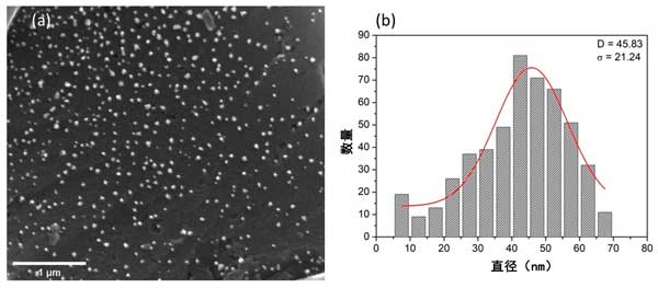 彩运cy888 图2:具有1微米比例尺的SEM图像显示纳米粒子在活性炭上的均匀分布(a)以及通过对活性炭混合纳米杂化材料的SEM直方图进行高斯拟合获得的尺寸分布(b)。