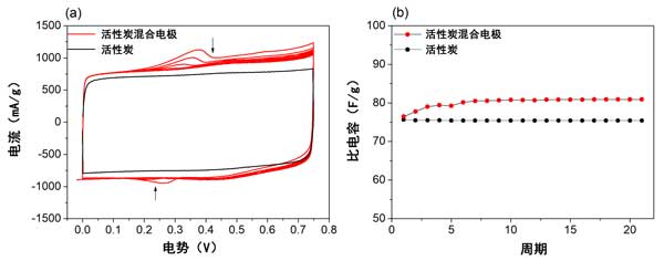 彩运cy888 图3:(a)使用1M/H2SO4电解质并以20mV/s收集的对称纽扣电池中电极的CV曲线,箭头表示CV循环数的增加。(b)比电容随CV循环次数的变化。