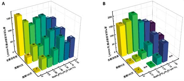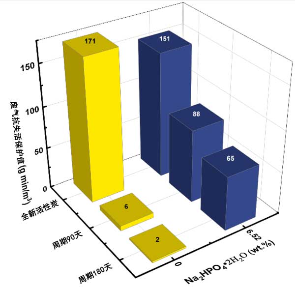 使用Na2HPO4·2H2O添加剂的实验在6.52%的浓度下进行,其摩尔当量相当于5.15%的NaH2PO4·H2O浓度。图3的结果表明,Na2HPO4·2H2O添加剂也能有效防止失活,但不如NaH2PO4·H2O有效。例如,失活180天后,防护值含有Na2HPO4·2H2O添加剂的活性炭浓度下降至65mg/min/m3相比之下,使用NaH2PO4·H2O添加剂的活性炭为107mg/min/m3。