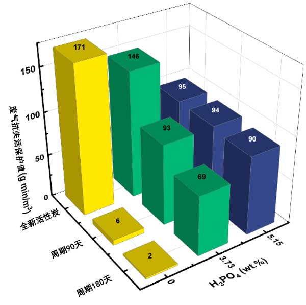 在实验条件下活性炭加速失活3个月和6个月,对比常态下的改性活性炭对抗废气的效果分别降低了59-89%和>75%。磷酸盐的添加抑制了活性炭的失活,失活3-6个月后防护值仅下降17~23%和32~37%。一般来说,与正常情况相比,保护后的活性炭可以提高吸附时长。其原因是失活后,特别是在没有添加剂的活性炭中,浸渍金属的化学吸附能力非常低。因此,废气的吸附主要通过物理吸附发生。干燥去除了占据物理吸附位点的水,从而能够通过物理吸附吸附一定量的废气。实际上,即使活性炭失活并超过其预期保质期,其保护能力也可能通过干燥而部分恢复。