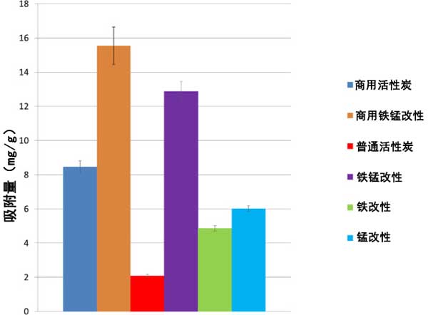 彩运cy888 为了比较各种活性炭吸附砷(V)的效果,将0.1克活性炭添加到50mL/50ppm砷(V)样品中。将样品以150rpm搅拌6小时,然后过滤,然后对滤液进行元素分析。为了比较不同活性炭基质的功效,以每克活性炭吸附的砷(V)毫克数(mg/g)来比较相对于添加的活性炭量的吸附。如图所示数字图1,与铁、锰和铁/锰一起官能化后,砷的吸附有显着改善。