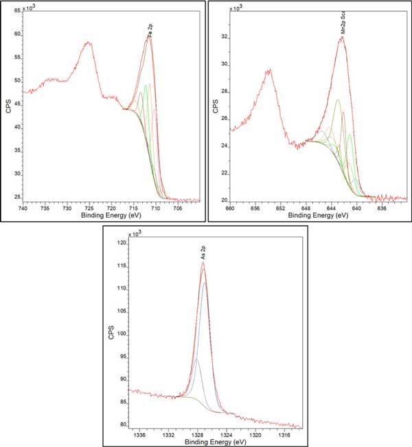 图2:负载FeMn的活性炭、As曝光后的Fe(左上)、Mn(右上)和As(底部)XPS峰的解卷积。
