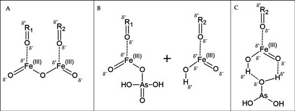 彩运cy888 图3:(A)显示物理吸附到活性炭表面的铁。(B)显示了由于暴露于砷而形成的两种铁产物FeOOH和中间体FeO–O–AsH2O3。(C)显示了还原的As(III),这是电子从活性炭流过铁的结果,通过氢键物理吸附到载铁表面。