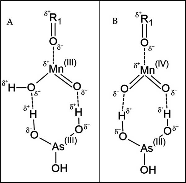 图4:(A)显示反应(1)的产物,其中MnO被氧化为MnOOH。(B)显示反应(2)的产物,其中MnO被氧化成MnO2。As(III)通过氢键物理吸附到负载Mn的表面。