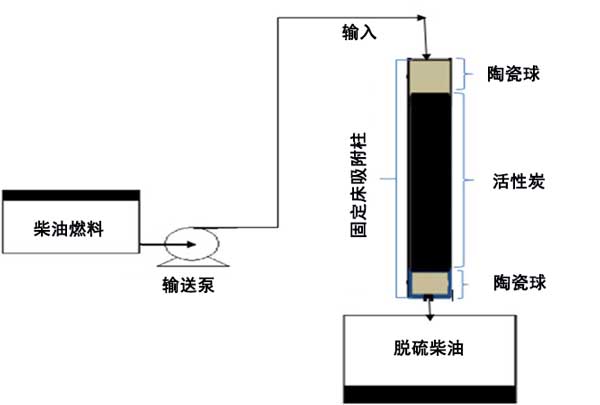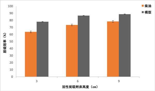 柴油和模型柴油用作油原料,以评估活性炭和改性活性炭的脱硫工艺。柴油初始硫浓度为7510ppm。两种柴油原料用于固定床吸附塔装置的脱硫工艺。为了进行脱硫实验,使用计量泵将油原料送入塔中。采用垂直向下固定床吸附塔装置连续吸附硫化合物,流量为1mLs-1。柱子逐渐装载不同高度的活性炭层(3-9厘米),对应于不同的活性炭重量(10、7和4克)。
