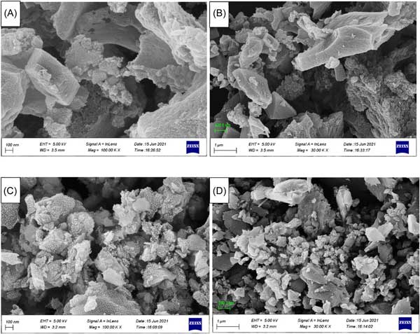 彩运cy888 图2:活性炭吸附剂的SEM:(A、B)活性炭(C、D)改性活性炭吸附剂。