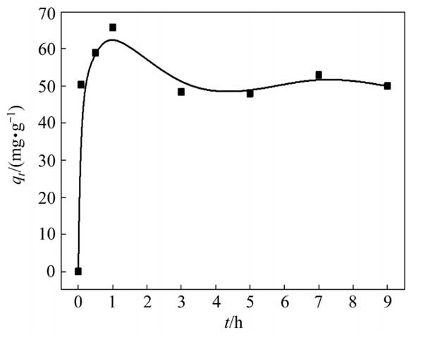 用100mL硫代硫酸铜溶液进行铜吸附动力学试验,初始铜浓度为3g/L。硫代硫酸盐与铜的摩尔比为8:1。除另有说明外,0.5g活性炭用于吸附试验。图2显示了Cu(S2O3)23−在活性炭上的吸附动力学。活性炭对铜的吸附容量在前1h急剧增加,随后略有下降并趋于稳定。