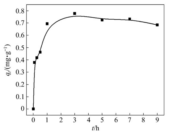 用初始浓度为50mg/L金的100mL硫代硫酸金溶液进行金吸附试验。硫代硫酸盐与金的摩尔比为8:1。除另有说明外,采用1.0g活性炭进行吸附试验。图3显示了金在活性炭上的吸附动力学。活性炭对金的吸附能力在初始阶段迅速增加。在吸附时间约为3h时观察到吸附峰,随后对金的吸附略有下降,说明金在活性炭上的平衡吸附基本建立。