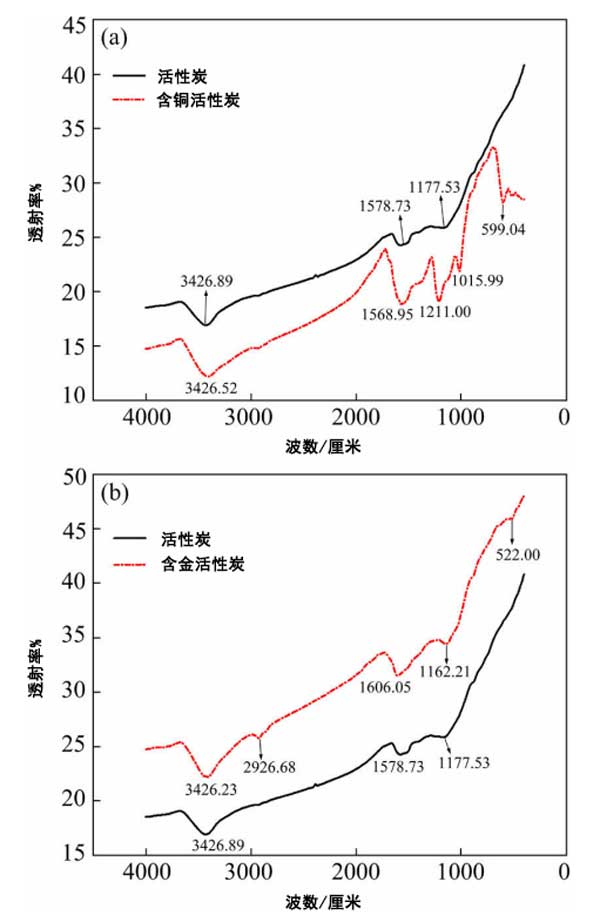 图4:原活性炭和含铜碳(a)、含金碳(b)的FTIR光谱。