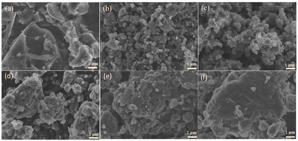 彩运cy888 图1:(a)活性炭、(b)研磨12小时、(c)研磨24小时、(d)研磨48小时、(e)研磨60小时和(f)研磨72小时的SEM图像。