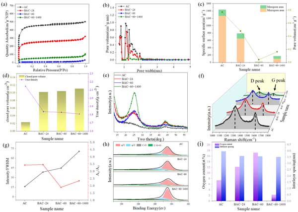 图2:球磨活性炭的结构表征。(a)N2吸附-脱附等温线;(b)孔径分布;(c)比表面积和孔体积;(d)闭孔体积和真密度;(e)XRD图谱;(f)拉曼光谱;(g)样品拉曼光谱的XRD(002)峰强度的变化;(h)XPSC1s谱;(i)氧含量和层间距。