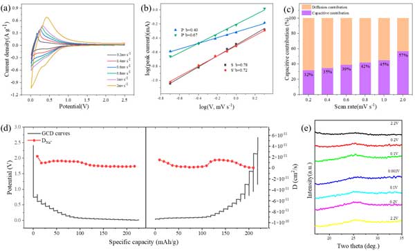 彩运cy888 为了研究球磨活性炭电极的钠存储机制,在半电池中以不同的扫描速率进行CV测试。图4a显示了热处理后活性炭研磨60小时在不同扫描速率下的CV测量,以评估速率行为。在较高的扫描速率下,CV曲线偏离标准位置,表明极化和欧姆电阻增加。方程i=avb用于探索测量电流(i)和扫描速率(v)之间的相关性,有助于确定扩散和电容对电化学行为的贡献。b的值表示主导过程(值接近1时为表面控制,值约为0.5时为扩散控制),由log(v)-log(i)图的斜率得出。如图4b所示,该图说明了峰值P/P'和S/S'的log(i)与log(v)图和拟合结果,以及P/P'和S/S'的计算b值峰值分别为0.40/0.67和0.78/0.72。这表明GCD曲线中低于0.2V的平台区域(对应于CV中的P/P'峰值范围)与闭孔中钠的缓慢填充有关。相反,GCD曲线的高电位倾斜区域与石墨纳米域中石墨烯夹层的钠提取/插入有关。在0.2mVs-1的扫描速率下,CV曲线显示电容容量占总容量的32%,而在2mVs-1下,电容过程主要控制电化学行为。
