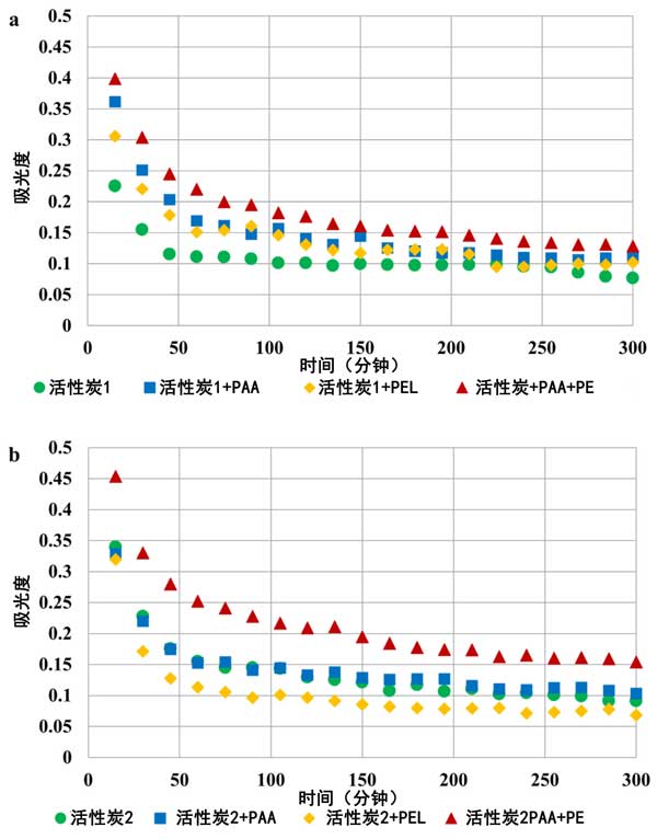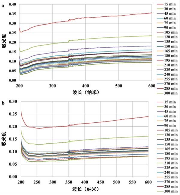 图3:活性炭1(a)和活性炭2(b)活性炭悬浮液在不同波长下的吸光度。