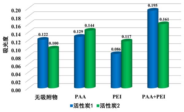彩运cy888 图5:单一和二元吸附质系统中活性炭1和活性炭2悬浮液在pH3时150分钟后的吸光度。