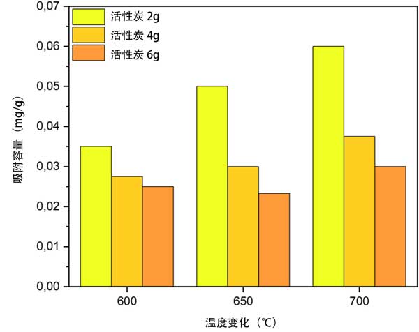 从测试结果可以看出,在700℃温度下,吸附剂质量为6g,浓度为0.2mg/L,降低百分比为90%。氨(NH3)浓度的降低与质量变化的增加和活化温度的升高成正比。吸附剂质量越大且温度越高,氨(NH3)浓度降低得越多。在图2中,显示了活性炭的吸附容量值。因此,可以得出结论,吸附剂质量为2g、温度为700℃时达到最高吸附容量,即0.06 mg/g。然而,尽管700℃下6g吸附剂质量显示出氨(NH3)浓度百分比降低,但与700℃下2g吸附剂质量相比,其吸附容量仍然较低,为0.03mg/g。这是由于NH3吸附过程是由分子间相互作用驱动的,例如静电引力、氢键、范德华相互作用等。此外,结果表明,源自肉豆蔻壳的活性炭可以有效降低氨(NH3)水平。那么活性炭具有良好的稳定性,并通过吸附容量值证明。