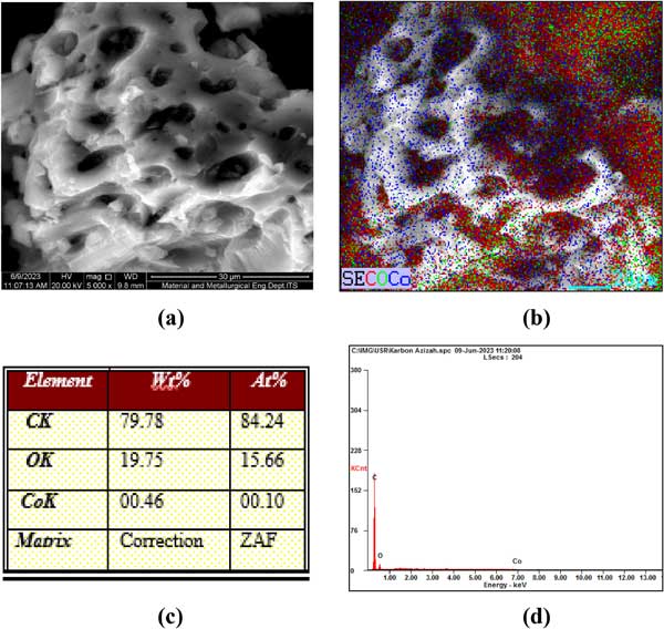 图3:(a)活性炭的形态结构,(b)元素C、O和Co的分布图,(c)样品中元素组成值表,(d)样品中元素组成值图。