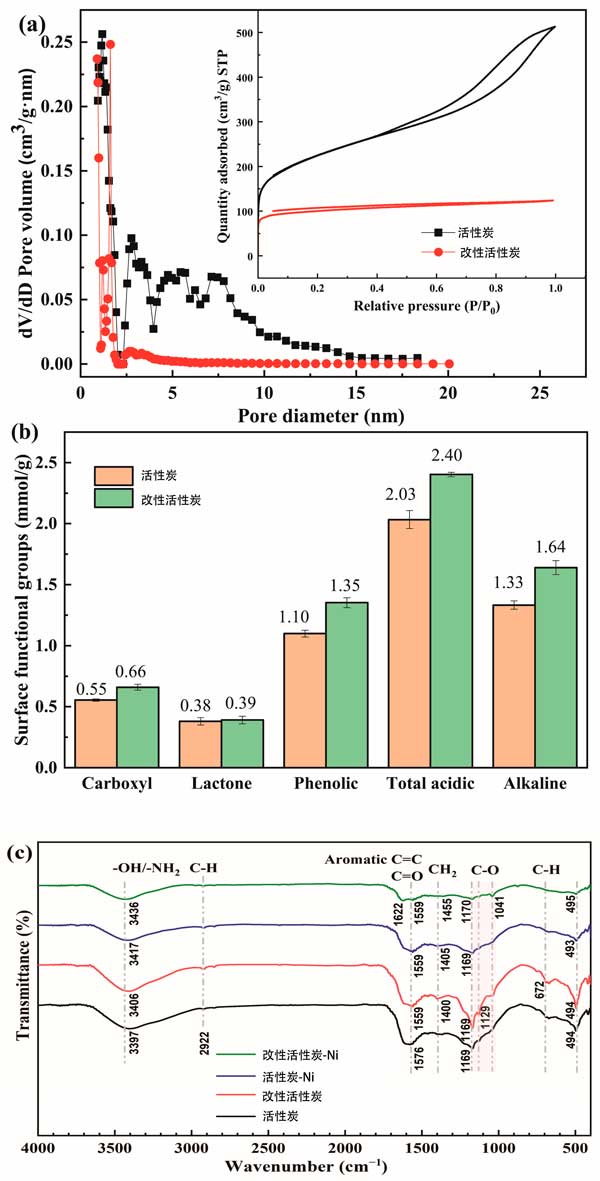 彩运cy888 图1:活性炭和改性活性炭的表征:(a)孔径分布和氮气吸附-解吸等温线;(b)通过Boehm滴定进行表面官能团分析;(c)Ni(II)吸附前后的FTIR光谱。