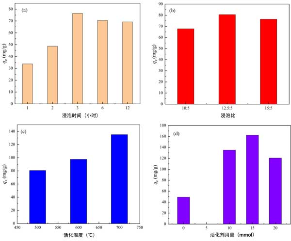 图2:不同制备条件下改性活性炭对La3+的吸附性能。(a)浸泡时间;(b)浸泡比例;(c)活化温度;(d)Na2EDTA用量。