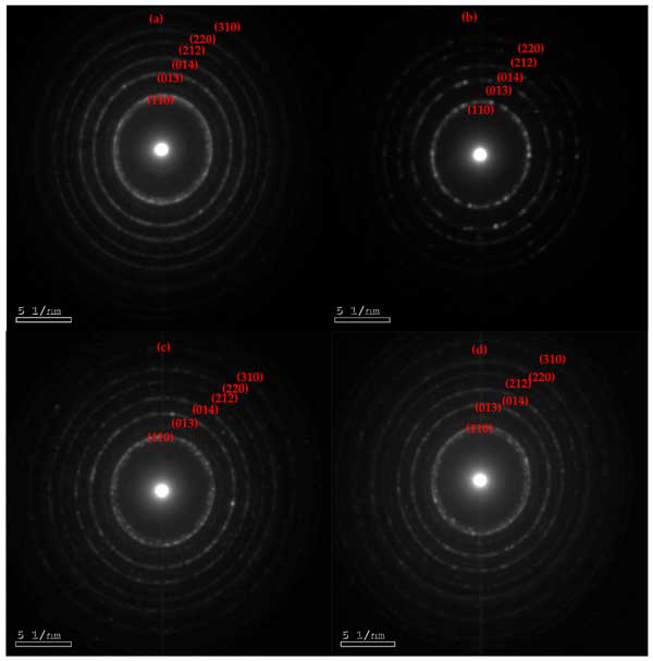 彩运cy888 图2:通过电子衍射HRTEM获得的合成(a)BiOI、(b)1C/BiOI、(c)5C/BiOI和(d)10C/BiOI纳米复合材料的SAED图像。