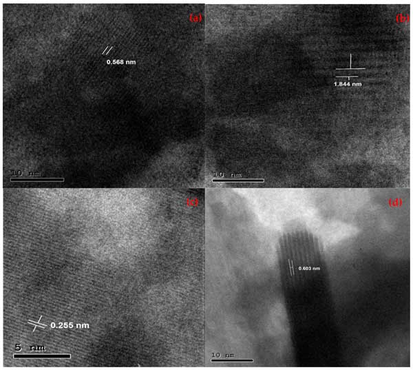 图3:合成的(a)BiOI、(b)1C/BiOI、(c)5C/BiOI和(d)10C/BiOI纳米复合材料的HRTEM d间距。