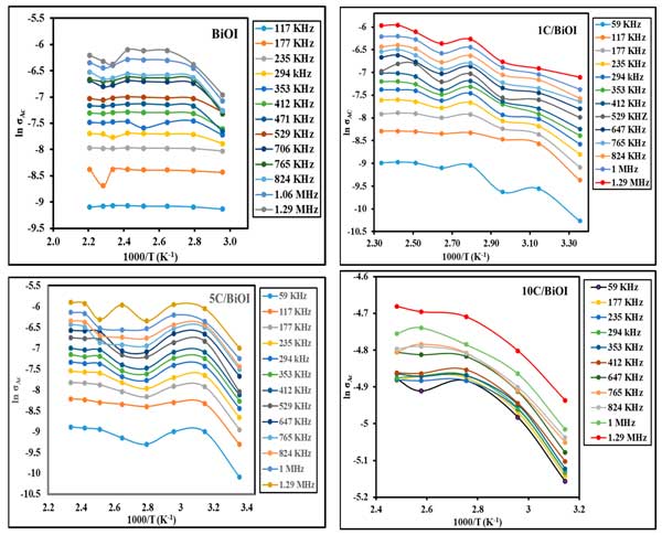 彩运cy888 图4:温度对BiOI、1C/BiOI、5C/BiOI和10C/BiOI纳米复合材料在不同频率下交流电导率的影响。