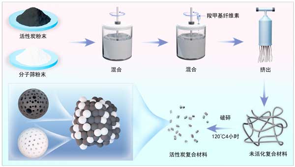 彩运cy888 活性炭之所以特别适合用于吸附过程,是因为它具有高度多孔的无定形结构,能够吸附各种分子。它具有微孔和中孔,可以容纳各种大小的分子,补充了分子筛的孔隙特异性。活性炭还具有利用功能基团改变其表面化学性质的潜力,从而增强其与目标分子的相互作用。本文以羧甲基纤维素为黏合剂,通过机械混合和挤出法制备了一系列 华活性炭分子筛复合材料(图1)。