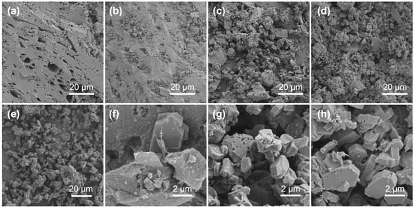 彩运cy888 图2:(a)活性炭、(e)分子筛、(b,f)活性炭复合材料-10%在不同放大倍数下的SEM图像,(c,g)活性炭复合材料-20%在不同放大倍数下的SEM图像,以及(d,h)活性炭复合材料-30%在不同放大倍数下的SEM图像。