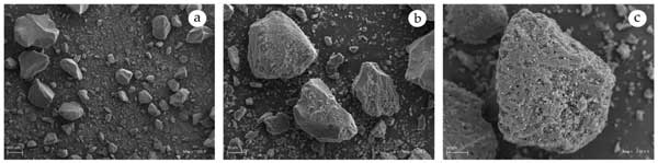 图1:不同放大倍数下的活性炭SEM图像:(a)100×,(b)500×,(c)1400×。
