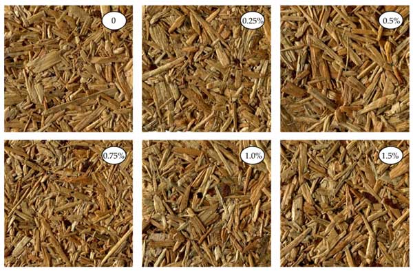 在UF树脂中添加活性炭还可以改善刨花板的各种机械性能。研究表明,活性炭可以提高板材的尺寸稳定性、强度和防水性。这在担心潮湿暴露的应用中尤其有益。所生产的刨花板的外观如图2所示。添加高达1.5%活性炭没有观察到任何影响。相反,在碳含量较高的情况下,所得板材变暗并变灰。因此,在不影响材料美观的情况下,这可以被视为较小负载的优势。