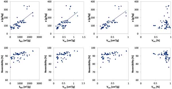 图1:氨吸附能力和可逆性与原材料、炭和制备的活性炭的多孔结构参数的相关性。