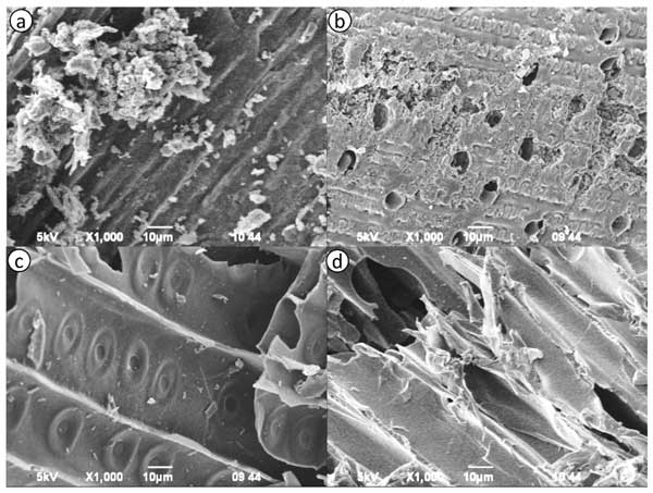图1a-d显示了来自不同植物来源的活性炭样品的形貌SEM图像。图像突出显示了样品表面结构和孔隙率的明显差异。图1a显示了粗糙的表面,表面具有高密度的不规则、未受干扰的颗粒。大量裂纹和裂缝的存在表明多孔结构发达。图1b显示出类似的多孔形貌,具有广泛的薄膜状结构和大空隙,表明活化和孔隙形成效率高。