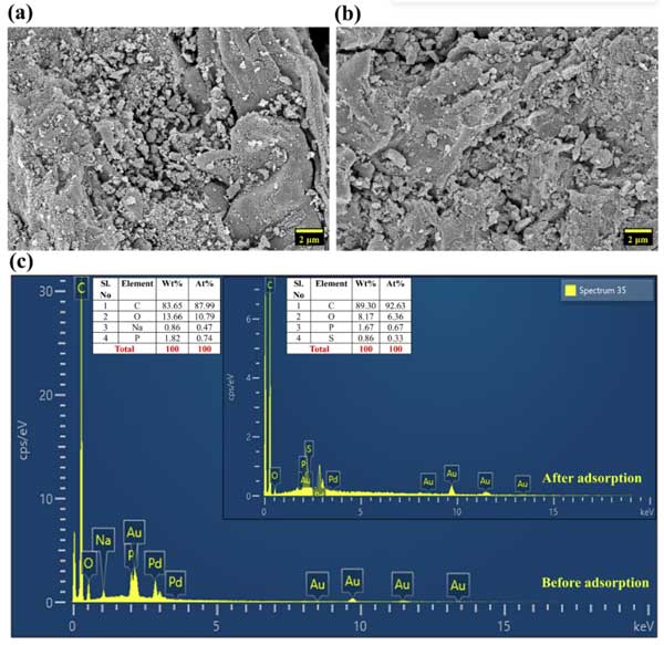彩运cy888 FESEM图像对吸附前后活性炭的形态变化提供了详细的视觉分析。吸附前图像(图1a)揭示了高度不规则和粗糙的表面形态,其特征是木质纤维素材料的多孔和片状结构。大型裂纹,空隙和颗粒状碎屑很普遍,所有这些都导致了高表面粗糙度,并增强了可用的表面积以吸附。此外,发达的孔隙的存在证实了正磷酸激活在建立层次多孔网络中的有效性,非常适合染料扩散。活性炭表面在吸附后经历了显着的形态转化(图1b)。最初粗糙和不规则的质地变得更加顺畅,表明刚果红分子的成功粘附。裂纹,空隙和孔隙开口的可见性降低,进一步支持了这种转变。进行EDS以分析活性炭的元素性质(图1C)。吸附之前,活性炭表现出C和O的主要峰,这确定了活性炭的形成。另外,在正磷酸激活期间引入的磷最初以痕量量存在。
